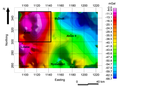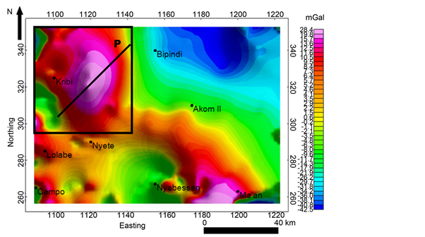 The first domain which covers the western part of the map is characterized by high values of gravity anomalies. The form of these anomalies suggests that it marks the limit of a large structure to the left of the study area. In the field, this area corresponds to low altitudes and its position near the Atlantic Ocean shows that this anomaly has it source from highly dense rocks. This domain, with anomaly values ranging between −40.1 mGal and −2.0 mGal presents four prominent peaks, one at the Lolabe locality, another one in Kribi and the last two to the east of Kribi. All these peaks can be interpreted as high density or basic intrusive bodies within the main formation. The two peaks observable to the east of Kribi may be considered as a unique, very high-value anomaly, which according to [6] corresponds to a ring complex affected by a nearly N-S trending