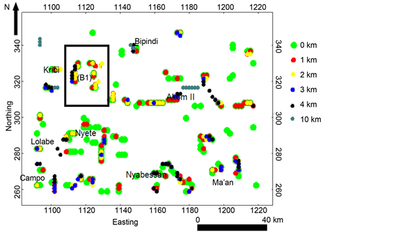After computing the horizontal gradient of the third order residual anomaly, the resulting map is upward continued at 0 km, 1 km, 2 km, 3 km, 4 km and 10 km. The local maxima are then calculated and superimposed. The choice of the high of the upward continuation is determined by the types and depth of the structures that we intend to highlight. Given that, the higher we upward continue, the deeper the structures are highlighted. In our study, we intend to model a shallow formation. The maxima of the gradient of the residual anomaly upward continued could be observed on the map until the depth of 10 km. after 10 km, no effect of the anomaly featured on the map. That is why we choosed to stop at 10 km. The Maxima of the horizontal gradient of the third order residual anomaly map upward continued to 0 km, 1 km, 2 km, 3 km, 4 km and 10 km as presented in Figure 6 shows lines and quasi-circular contacts corresponding to horizontal limit of lineaments and intrusive bodies respectively. The depth of a lineament or an intrusive body is determined by the continued presence of the local maxima for increasingly high altitudes of upward continuation. This study will be focused on the continued presence of a quasi-circular contact noted (B1) in the Kribi area in the analyzed maxima of the horizontal gradient of the residual anomaly map upward continued to 0 km, 1 km, 2 km, 3 km, 4 km and 10 km.