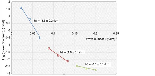 Figure 7 shows the representation of the logarithm of the gravity power spectrum (energy E) with respect to wave number (spatial frequency) for the profile P. The curve obtained from this representation, made up of 9 points is observed to have three (3) slopes represented by the 3 colored lines fitted into the figure, each of which is obtained from 3 points. The depths obtained from the slope of the curve represent the average depths of the top of the anomalous source. This spectral graph presents three gradients that are used in determining the average depths h1 = 3.6 km, h2 = 1.6 km and h3 = 0.5 km of interfaces of low, average and high spatial frequencies respectively. The resulted values observed on the graph suggest that the depth to the upper surface of the intrusive body B1 is not uniform. It is believed that h1 presents the average depth of the bottom of B1, while h2 and h3 are depths to particular sections of the roof of the intrusion. These values obtained using spectral analysis will serve as constraints for the modelling of the body.
