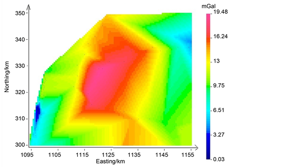 the context of the present study. The Kriging method was applied on the gravity data for interpolation using kriging gridding algorithm implemented in Oasis Montaj 8.0 software. The maximum value of the Bouguer anomaly in the grid is −68.7 mGal while the minimum value is −2.0 mGal. Figure 3 shows the distribution of the data points, new and existing ones, in the study area.