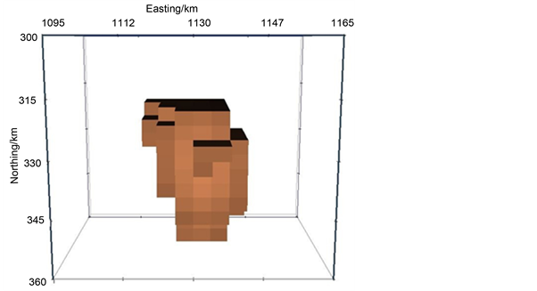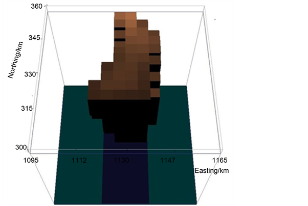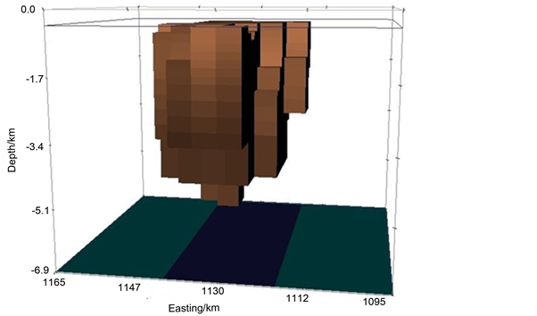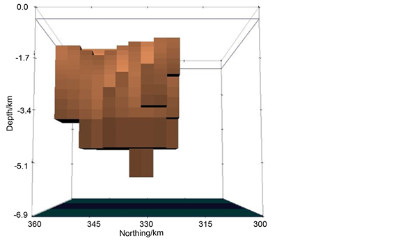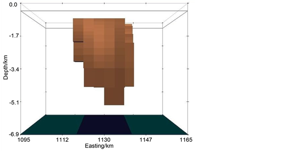 Figure 13. 3D model of the Kribi dense intrusive body as viewed from the East.