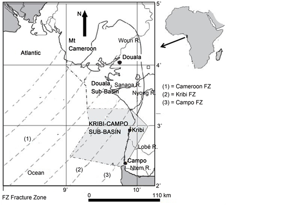 Figure 1. Location of the Kribi-Campo sub-basin in Cameroon (West Africa) between the main fractures of the Cameroon margin (modified after [2] ).