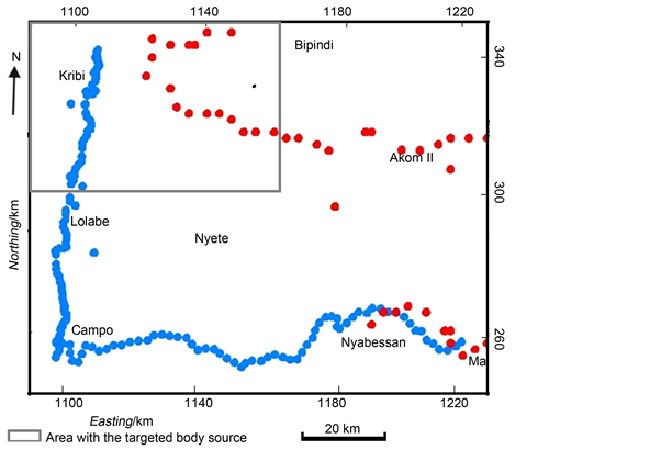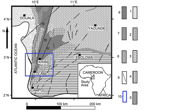 The Kribi-Campo sub-basin, is a sedimentary basin which lies both onshore and offshore on the cost of Cameroon between latitudes 2˚20'N - 3˚20'N and longitudes 9˚15'E - 10˚00'E covering a total surface area of about 6195 km2 (Figure 1). The sub-surface of the Kribi-Campo sub-basin is mostly made up of Archean rocks of the Ntem complex recovered by the Paleoproterozoic rocks of the Nyong Unit [7] .
