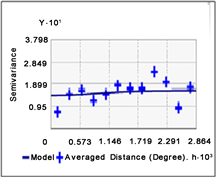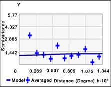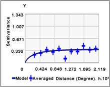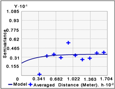 where C0 is the nugget, C1 is the partial sill, and a is the range of spatial dependence to reach the sill (C0 + C1). The semivariance generally increases with sample separation distance before reaching an asymptote а (the range value). Samples separated by distances greater than range value are considered to be spatially independent where as, within the range, samples show greater similarity when they are nearer to each other [21] . Variance that exists at а scale smaller than the field sampling is found at zero lag distance and is known as the nugget variance (C0) [22] .