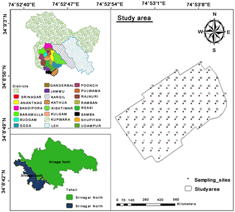 The present investigation was carried out in a Research farm of SKUAST-K, Shalimar (34˚8'42" and 34˚9'3"N latitudes and 74˚39'5" and 74˚53'5.6"E longitude) Srinagar (Figure 1). It has 1615 m average altitude above sea level and covers an area of 23.8 ha. The climate is temperate and characterized by mild summers and chilling winters having normal annual maximum temperature of 19.53˚C and minimum of 6.80˚C with normal annual rainfall of 786.2 mm. Dominant vegetation are cereals (wheat, rice, maize, oats), vegetables, fruits and floriculture.