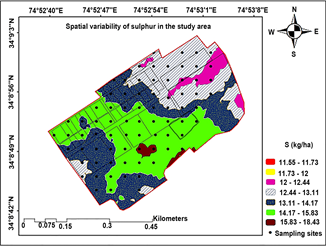 Variation at microscales smaller than the sampling distances will appear as a part of the nugget effect [37] [46] . The value of nugget varied widely for soil properties. It was highest for sulphur (S) and the lowest for soil pH. Lower values of nugget effect (C0) indicate low errors in measurements. The high nugget