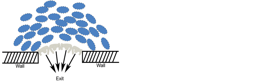 Figure 2. Scheme of an arc formation at openings and bottleneck areas. The full ellipses re- present pedestrians moving in the same directions. The pedestrians block one another in the direction of the movement and congest the passage area.