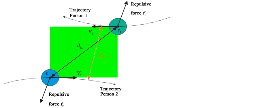 Figure 3. Collision avoidance rectangle of influence. Illustration of pedestrian-pedestrian col- lisions avoidance forces. This force is referred as repulsive force and reaches its max. value at the shortest distance between the particles.
