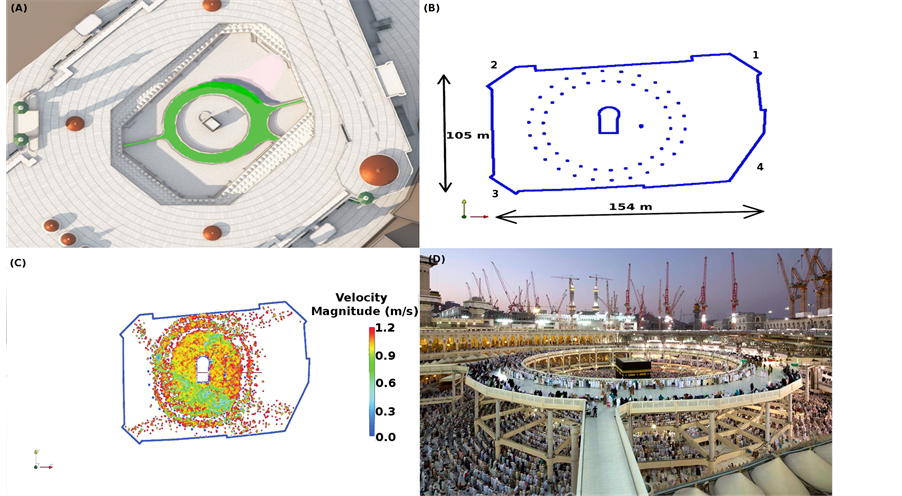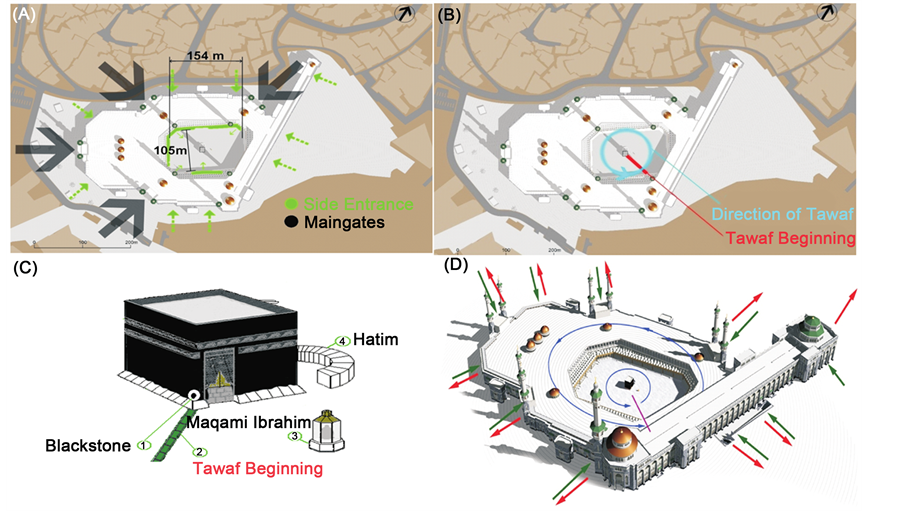 Figure 4. (A) Illustration of the Mataf dimension; (B) the direction of the Tawaf movement; (C) the Mataf description: (1) the black stone, one of the most overcrowded regions in the Haram, the measured local density ρ(r, t) in this place reached 9 persons/m2, (2) the green strips on the ground indicate the begin and end of the Tawaf movement, (3) Maqam Ibrahim, hysterical monument near the Kaaba that must be considered in the simulation; (D) the gates and entrances to the Mataf.