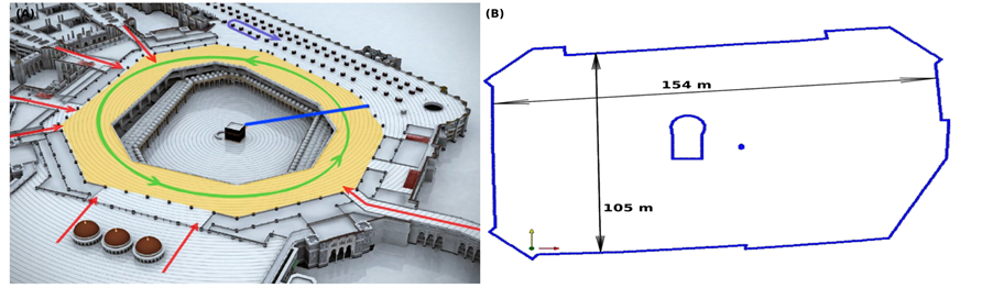 In Figure 4(D), a 3D model of the Haram Mosque in Mecca is illustrated. This model shows the main gates, doors, side entrances, and stairs to the Mataf open air area of the Haram. The start/end of the Tawaf is indicated by the red line. The blue line indicates the Tawaf movement direction on the roof of the mosque or in the piazza of the Haram near the Kaaba.