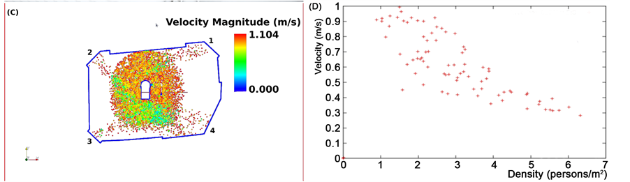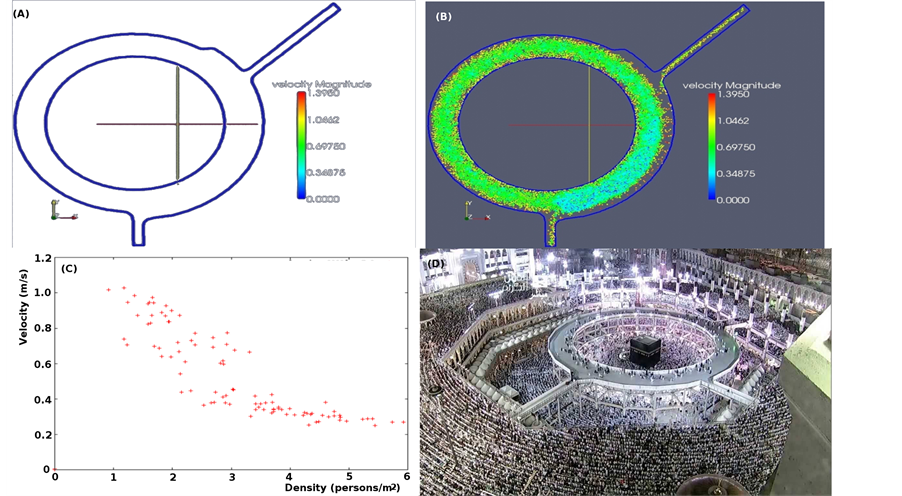 Figure 5. (A) 3D-model of the mosque building in Mecca. Main gates and entrances are indicated through the red arrows, the green arrow indicates the direction of the Tawaf movement, the blue line indicates the beginning and the end of the Tawaf and the pink arrow indicates the Sa’y movement; (B) Mataf dimension; (C) PedFlow simulation snap-shot results, the numbers 1, 2, 3 indicate the entrances or particles streaming in the Mataf area and the number 4 particles streaming out of the Mataf or the exit from the Mataf toward the Sa’y area; (D) Decrease of the pedestrian velocity in the Mataf area as a function of the local density, the measured data are represented by the crosses, they are consistent with the empirical data of Predtetschenski and Milinski [13] .