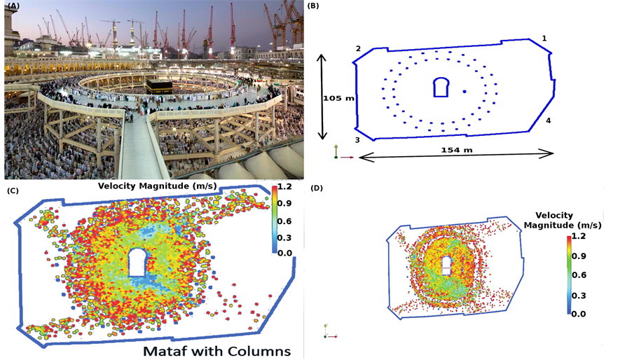 Figure 7. Snapshot 2: (A) (mobile mataf floor) at Mataf area in Al-Haram Sharif, one can see the columns (pillars) bearing the mean structure of the temporary Mataf; (B) A CAD drawing displaying the Mataf area with columns; (C) and (D) Illustrating a movement of pilgrims in the Mataf area (PedFlow simulation results). The simulation shows a vacant ring since the pilgrims avoid the circle on which the columns are placed. In the region of the beginning and end of the Tawaf ingoing people push back the outgoing people. Thus, it creates a trap becoming more and more crowded.