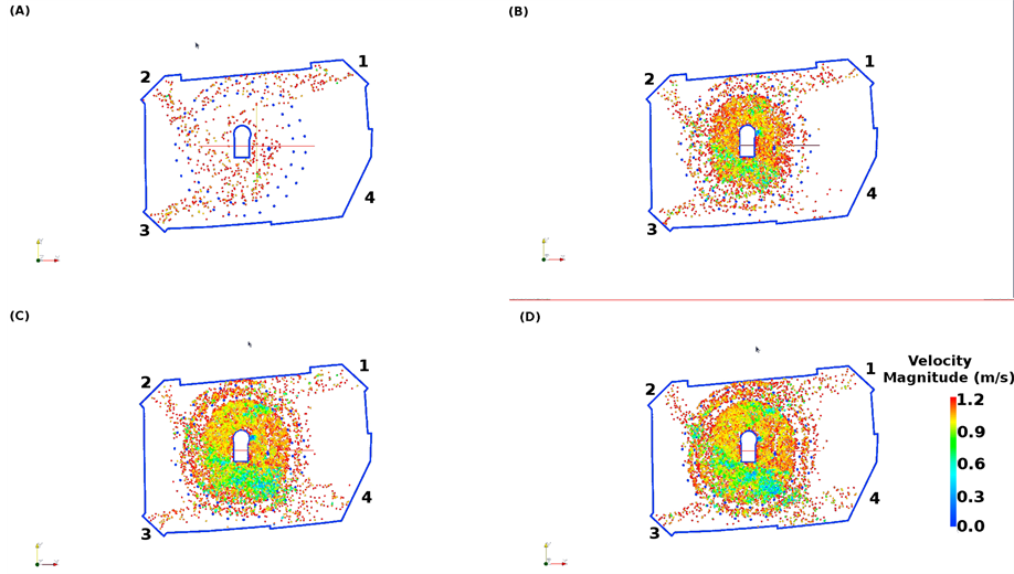 Figure 8. Pilgrims streaming the Mataf area through three different gates denoted by 1, 2, 3 and leaving the Mataf floor through gate 4. Step by step simulation of a pedestrian flow circling seven time the holy Kaaba ((A); (B); (C) and (D) illustrate time consecutive PedFlow animation snapshots). The impact of the columns on the pilgrims movement per- forming the Tawaf are demonstrate. The red colour indicates pedestrian walking with their desired velocities and the turquoise colour indicates pedestrian walking with lower velocities.