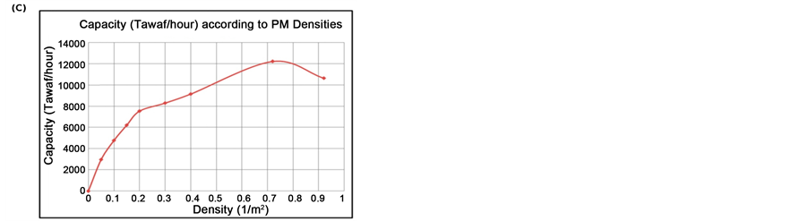According to the Predtetschenski and Milinski fundamental diagram Figure 10(B), the capacity of the mobile Mataf was determined. The results of this investigation are illustrated in Table 2. The capacities of the mobile floor were computed with respect to different pedestrian densities. Every density in the fundamental diagram is related to a certain velocity. With help of these given velocities we tried to calculate the mean average time for one complete Tawaf. Afterwards we calculated the capacity of the Mataf. We can see that the optimal capacity is about 12,000 Tawaf/hour, (see Figure 10(C)). This result consistent with the simulation result which is about 13,954 pilgrims per hour completing the Tawaf.