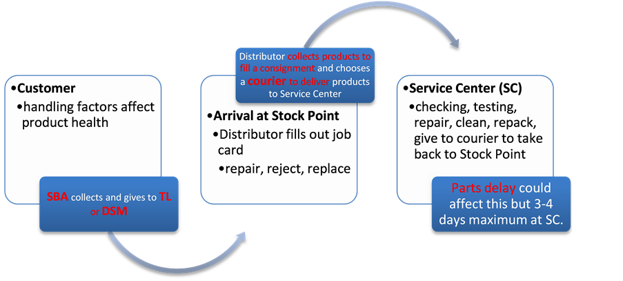Once the customer hands over the product to GLP staff, the entire process of repairing and returning should only take 20 days. However, the field visit revealed that one of the biggest challenges faced by GLP’s direct marketing business model was delay in the maintenance and repair of products. This delay comes from a few specific parts of the process. Delays in the transportation of broken products to and from a stock point may be one of the biggest problems. The distributor is responsible for this as he is responsible for choosing the transportation courier. In addition, the distributor may wait for a certain number of broken products to collect at the stock point before sending them all together as part of the same consignment to the service center. The sales team may also be responsible for delays by failing to pick up the products from the customers in a timely manner to pass over to the distributor. Figure 7 depicts the process of repairing Sun King products from customer to service center. Elements written in red font in the figure represent areas where delay may be introduced into the process.