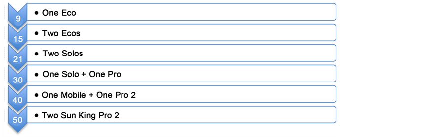 Incentives, or sales “boosters” for SBAs are established on the basis of the number of products an SBA sells every month. Figure 5 shows the required number of products sold (in blue) along with the corresponding boosters received listed on the right. Boosters are essentially Sun King products given to SBAs to keep for themselves or to sell at full retail value giving them 100% of the proceeds from the sale. In addition, SBAs may receive things like irons, sewing machines, and other household appliances equaling the value of certain Sun King products as boosters.