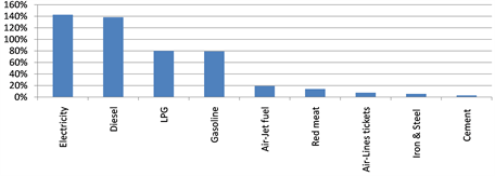Figure 5. Percentage increasing in fuel and good prices due to implementation of the carbon tax.