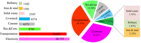 Figure 4. The annual CO2e (103 ton/year) emitted by sectors, and the share of each sector in total CO2e emissions.