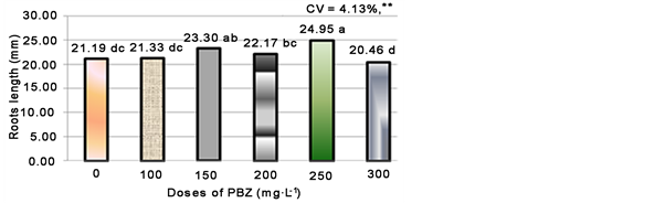 The analysis of variance indicated highly significant differences in roots length (p < 0.01), so that with Tukey’s test (α = 0.05) it was detected that the effect caused by the doses of 150 and 250 mg∙L−1 of PBZ was statistically the same, but higher than those observed in the control plants and in those treated with 100, 200 or 300 mg∙L−1. With 150 and 250 mg∙L−1 the increments respective were 9.9 and 17.7% relative to the control (Figure 3). Similar results were obtained by Bello-Bello et al. [7] after applying solution with 2 mg∙L−1 of PBZ.