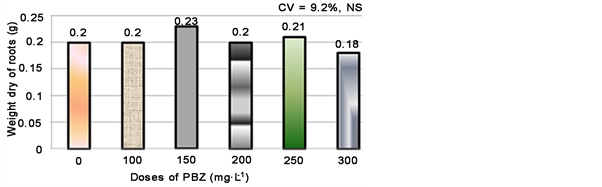 This other study variable was also expressed without statistical differences between the means that induced the different doses of PBZ and the control (Figure 5); however, with 150 mg∙L−1 it was have an increase of 15.0% with respect to the control. These results are also closely related to those of Partida-Ruvalcaba et al. [13] , mentioned in the previous paragraph.