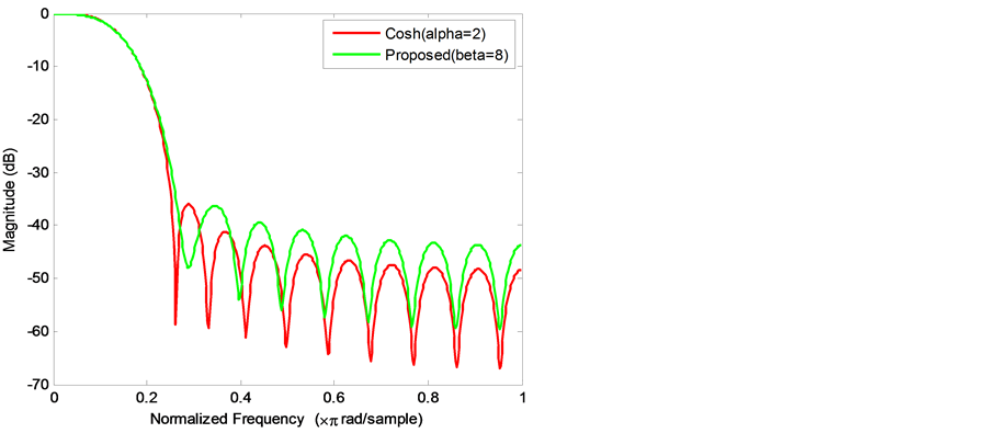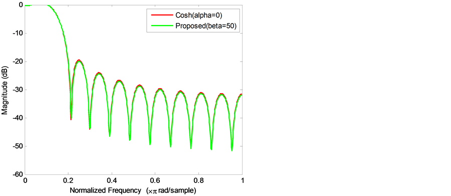 Table 5 shows the corresponding data of the two windows for window length N = 20. It is clear that, for different values of adjustable parameters α and β, the proposed window provides slightly greater minimum stopband attenuation than Cosh window for almost equal main-lobe half width. For example, when α = 0 and β = 50 our proposed window results better minimum stopband attenuation and equal mainlobe half width compared to Cosh window. The same performance is obtained for α = 1 and β = 14. But for α = 2 and β = 8 our proposed window remains superior in terms of stopband attenuation only. Thus for higher values of β better performance of our proposed window is more significant.