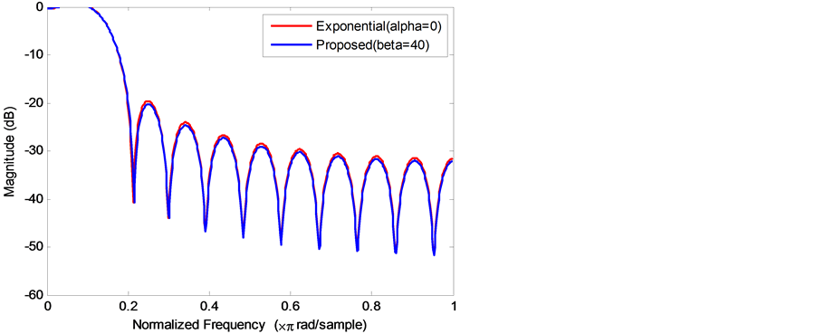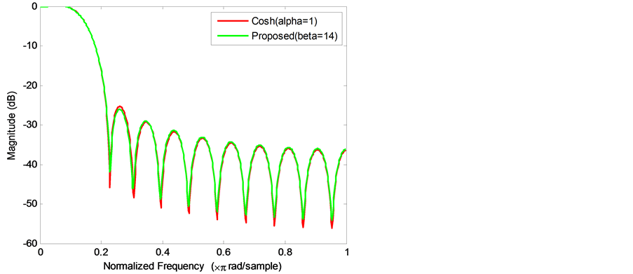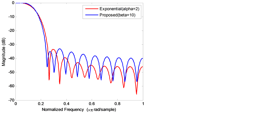 As mentioned previously, it has been proposed that for the same window length and main-lobe width, the exponential window provide better side roll-off ratio but worse ripple ratio and Cosh window provides better minimum stopband attenuation compared to Kaiser window [7] [8] . For zero value of adjustable parameter, both Cosh and Exponential windows behave like rectangular window providing narrower main-lobe half width. It is desirable for some applications to obtain greater minimum stopband attenuation compared to these two windows while having the same main-lobe half width [7] [8] .