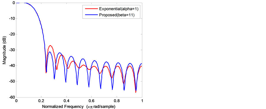 Figure 7 shows the frequency response characteristic comparison curve between Exponential window and proposed window. For all values of adjustable parameter, proposed window make a good compromise between the contradictory parameters