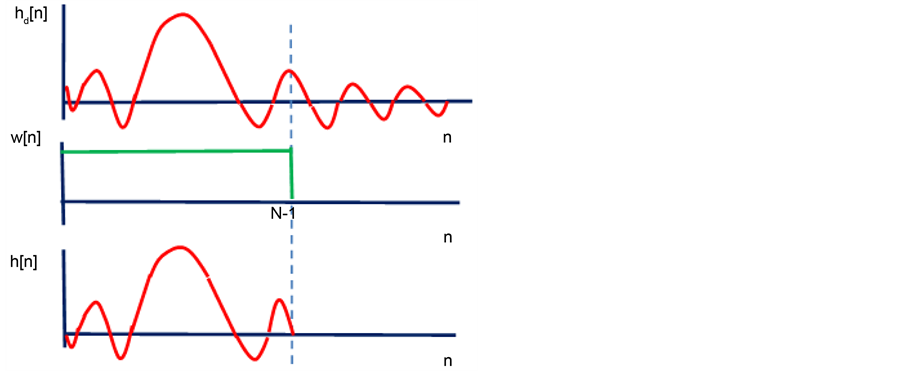 Ideal filters have perfectly flat passband with infinite attenuation in the stopband. Unfortunately these filters are practically unrealizable because of their infinite number of co-efficients in the time domain. Hence in order to implement them, the co-efficients must be truncated [1] . Figure 1 shows the truncation of ideal impulse response hd(n) by a finite length sequence W(n) whose values range from 0 to (N − 1) to get a Finite Impulse Response h(n) having a length of N. However direct truncation results in unwanted ripples in the passband commonly known as “Gibbs phenomenon” as shown in Figure 2.