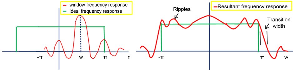 This is because multiplication in the time domain (Figure 2(a)) is equivalent to circular convolution in the frequency domain (Figure 2(b)). Moreover, this is the main reason for the contradiction between minimum stopband attenuation and main lobe width of windowed filters. From Figure 2(b) it is clear that there are unwanted ripples in the resultant frequency response curve of the window. Also, the transition width becomes wider compared to the ideal case. Rather than direct truncation, a smoothly taper curve known as “Window” is used [1] . It is the shape of the window that necessarily determines whether it results in better stopband attenuation or better transition width or both of the designed filters.