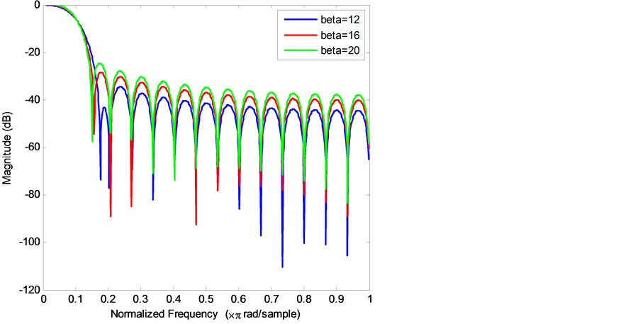 dB, −40 dB, −45 dB, −50 dB, −55 dB, −60 dB, −65 dB, −70 dB, −75 dB, −80 dB, −85 dB, −90 dB, −95 dB, −100 dB and obtained the corresponding values of β using Equation (2). From Figure 4 it is clear that in order to obtain a stopband attenuation of −100 dB we require approximate values of β = 5, 6, 7, 9, 11, 12, 13, 14 for N = 30, 40, 50, 60, 70, 80, 90, 100 respectively. Again we observe that for N = 30, a stopband attenuation of −20 dB is obtained when β = 48 and a stopband attenuation of −100 dB is obtained when β = 14.