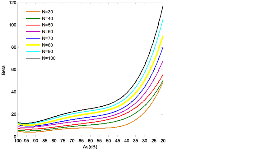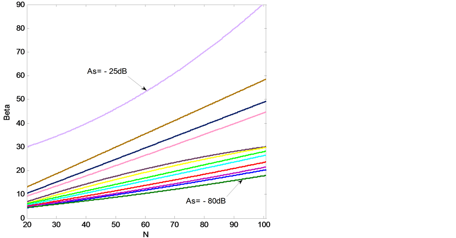 In some applications window length N is kept constant. To obtain an approximate value of β for a given N and As, windows of length N = 20, 30, 40, 50, 60, 70, 80, 90, 100 were designed to cover the range −25 dB ≤ As ≤ −80 dB. Figure 5 shows the plots of
