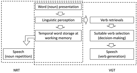 We further found performance-specific DBA index and ERP traces from subtraction analyses data. Figure 9 shows a schematic diagram of cognitive processing predicted during NRT and VGT. By subtracting the common processes, we obtained the difference given by the additional processes of VGT, including verb retrieval and decision-making for selecting a verb suitable to the presented noun. The negativity of the subtracted DBA index difference over the time window from the onset of the word (noun) presentation to arrival of the speech cue (Figure 6(a)) is given by sustained attention for the VGT-specific cognitive processes as mentioned above. Such durable attention is consistent with the previous finding that the working-memory remains active during tasks while the DMN is deactivated [22] .