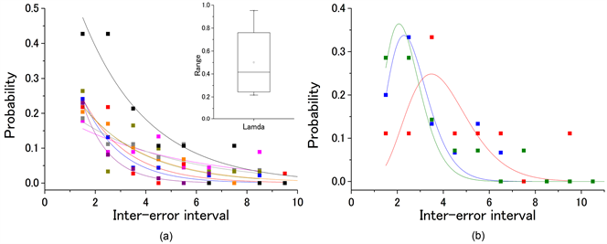 To examine this hypothesis, we statistically analyzed error intervals, derived from the number of errors listed in Table 2. The PDFs determined for most of the subjects exhibited good correspondence (p < 0.05) with exponential distribution derived from Erlang distribution,
