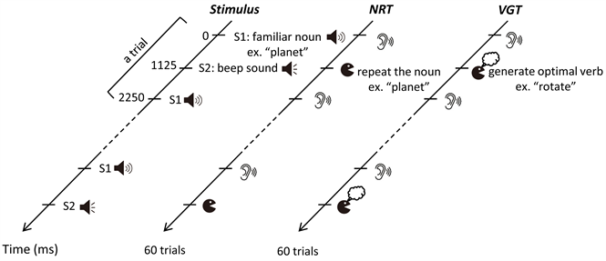 A series of auditory stimuli consisting of 60 pairs of sounds S1 and S2 were used for this study (Figure 1). S1 represented the sound of a single familiar Japanese noun, while S2 was a beep sound used as a speech onset cue. Sounds S1 and S2