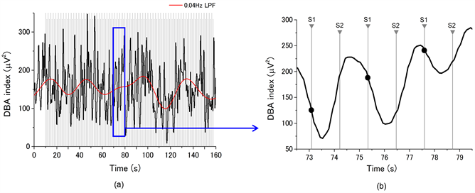 Figure 2. Two time series signals of deep brain activity (DBA) index. (a) The slow component of DBA index corresponding to the frequency of 0.04 Hz; (b) The fast component of DBA index. Additional processing was performed with data extracted in a limited time range of approximately 2 s from the original DBA index data based on the onset markers of S1 as event markers, excluding outliers. The averaged temporal waveforms were defined as event-related (ER) DBA indices. Baseline correction was performed 200 ms prior to the onset of noun presentations (S1).
