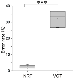 We assessed the behavioral performance of subjects as CR, IR, or NR for each NRT and VGT trial, according to the criteria described in Materials and Methods. Table 2 lists the assessed results for all subjects. Error rates were significantly lower for NRT than for VGT (p < 0.001) (Figure 3).