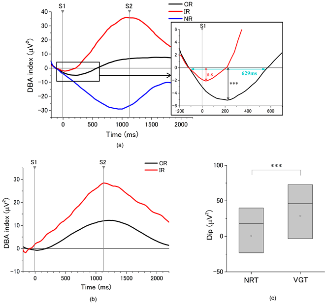 Figure 4. Event-related analyses on DBA index data. (a) CR (n = 335), IR (n = 101), and NR (n = 51) data for VGT. The CR group showed a dip below the baseline [***: p < 0.001 (p = 1.9e−20), power = 1]. The dip of the IR group was not significant (p = 0.42, power = 0.13); (b) CR (n = 554) and IR (n = 15) data for NRT; (c) Comparison of DBA indices between CR groups of NRT and VGT [***: p < 0.001 (p = 1.2e−13), d = 0.52]. n, sample size; d, Cohen’s d.