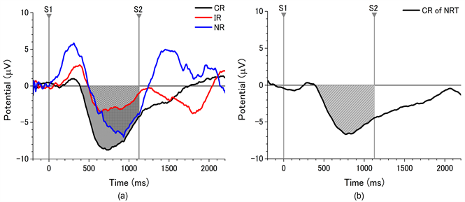 Figure 5. Event-related potential (ERP) waveforms. (a) ERP waveforms calculated for different three CR (n = 221), IR (n = 66), and NR (n = 35) behavioral groups of VGT; (b) ERP waveform calculated for the CR (n = 460) group of NRT. n, sample size.