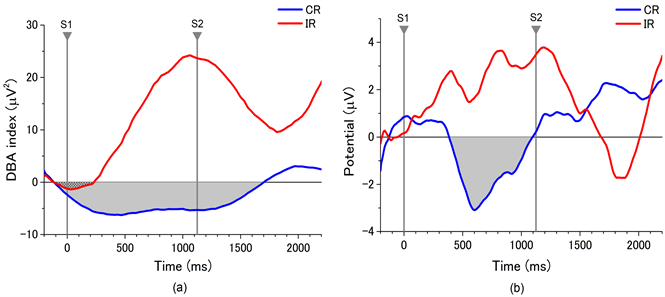 An event-related design, which can be applied to the fast component of DBA indices, was developed following a conventional event-related potential (ERP) paradigm. Additional processing was performed with data extracted in a limited time range of approximately 2 s from original DBA index data based on S1 as event markers, excluding outliers. The averaged temporal waveforms were defined as event-related (ER) DBA indices (Figure 2). Baseline correction was performed 200 ms prior to the onset of noun presentation (S1). The event-related features of dACC activities were numerically estimated using the ER-DBA indices, avoiding background spontaneous brain activities. The time resolution was expected to be approximately 0.3 s, taking into account that the alpha-2 (10 - 13 Hz) frequency band was regarded as an occupied single-side-band modulation band including temporal information [49] ER-DBA index traces under this time resolution were expected to distinguish between a few events per second.