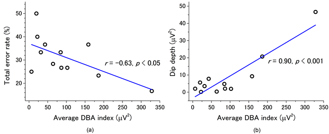 We were especially interested in errors committed during VGT, because this task was associated with higher-order cognitive functions. Therefore, we investigated personal differences in behavioral performance based on the DBA index of each subject. The average DBA index showed a strong negative correlation with the total error rate including IR and NR groups, and a strong positive correlation with the dip depth of the ER-DBA index waveform of the CR group (Figure 7(b)).