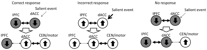 Figure 8. Schematic representation of performance-dependent dynamic interactions between dACC, IPFC, and CEN/motor system during cognitive processing.