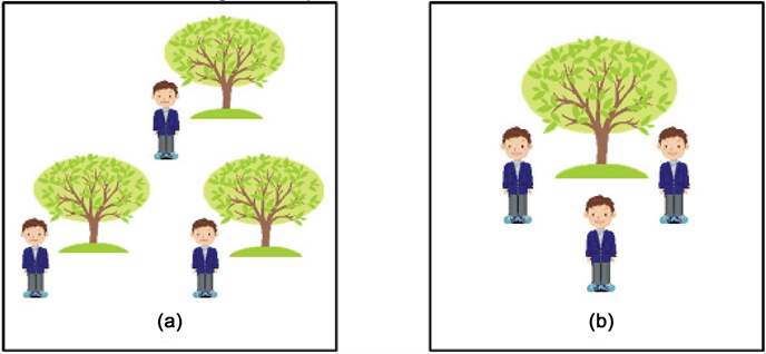 Figure 1. Two possible interpretations of a Quantifier Scope Ambiguous sentence. Example of two possible interpretations of Quantifier Scope Ambiguous sentence, Every kid climbed a tree, where (a) and (b) correspond with plural and singular interpretations of the word tree, respectively.