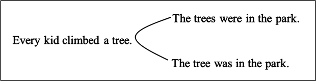 In [2] , (see also [4] ) sentences such as Every kid climbed a tree were investigated. These sentences, which exhibit quantifier scope ambiguity (QSA), are of interest because they have more than one interpretation, despite not being syntactically or lexically ambiguous. The ambiguity has to do with the quantity of entities plausibly inferred. That is, on one reading of Every kid climbed a tree, several trees are climbed, on another just one (see Figure 1).