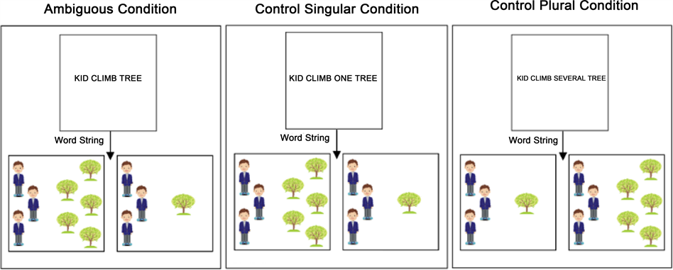 Figure 3. Examples of critical stimuli. An example of the ambiguous critical stimuli item, kid climb tree, for picture-matching task, and its singular (kid climb one tree) and plural (kid climb several tree) control conditions.