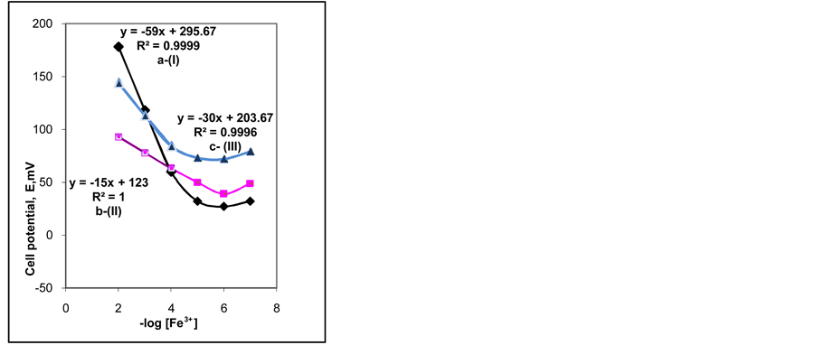 Figure 2. Calibration graphs for iron-ISE comprising: (a) Mem- brane-I; (b) Membrane-II; (c) Membrane-III.