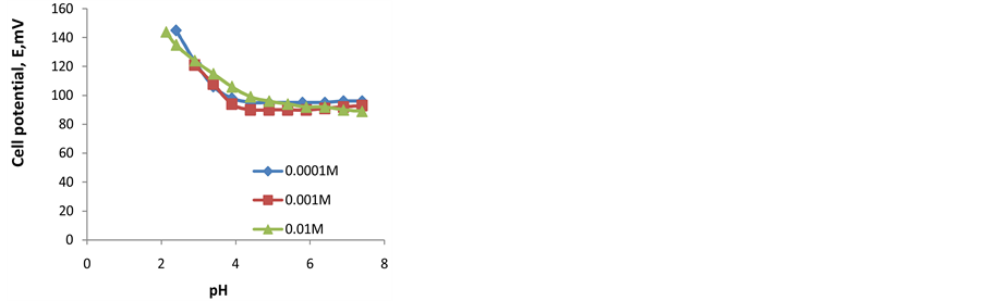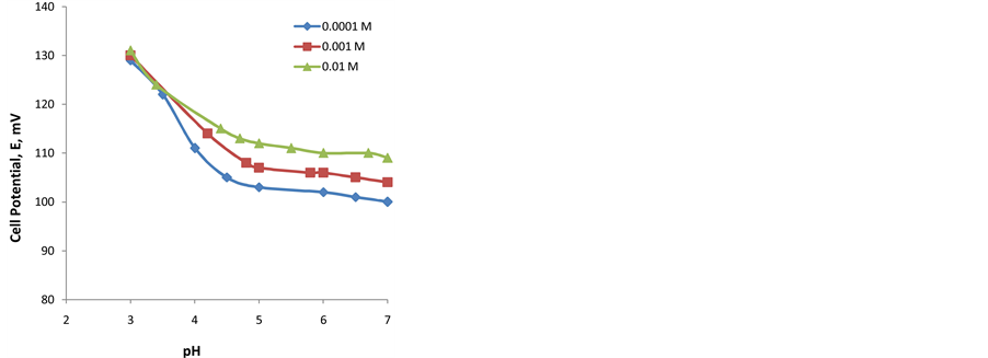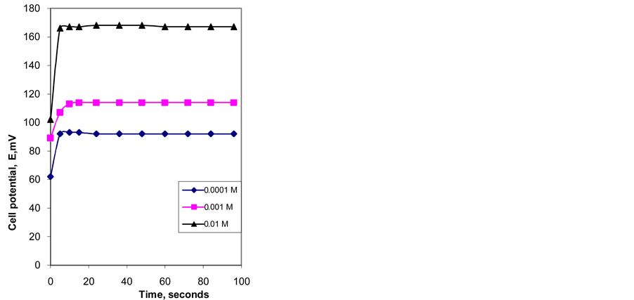 Response time was estimated according to IUPAC definition [12] . It is the time between the instant when the electrode was brought into contact with sample solution and the first instant when emf/time slope becomes equal to the limiting value selected on the basis of experimental conditions. Dynamic response of the proposed electrode is shown in “Figure 3”. From the figure it is shown that response time is between 5 - 10 s for the measured concentrations between 10−2 - 10−4 M.