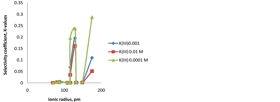 Ag+) for the electrode type III in the three concentrations (0.01, 0.001, and 0.0001M) [15] . Less values were observed either when ionic radius is less or more than 129 pm. This can be explained due to that Ag+ fits the ionophore cavity, which results in highest interaction. The same behavior was proved for the Fe-ISE with mem-