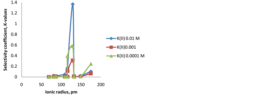 The relation between ionic radius of interferent cations and the values of selectivity coefficient is shown in