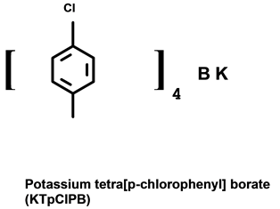Figure 1. Structural formulas of: (A) 37-bis-[(diethoxy-thiophosphoryl)oxy]-5, 11,17,23,29,35-hexa-kis-(1,1-dimethylethyl)-calix[6]arene-38,39,40,41,42-pentol; (B) potassium tetrakis-[3,5-bis-(trifloro-methyl)-phenyl] borate.