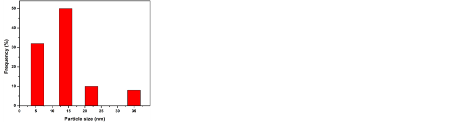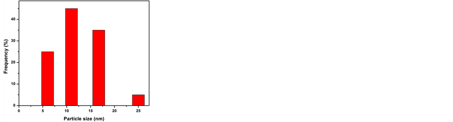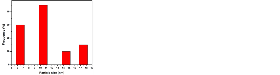 Figure 1(a)-(c) show TEM images of the AgNPs prepared under varying concentrations of trisodium citrate. The images show that all samples (S1, S2 and S3) are roughly spherical in shape and irregular in distribution. Nevertheless, some aggregation was observed in S3. The diameter of the nanoparticles was determined using a millimetre scale. The number of particles was counted within a bin of 5 mm [15] . As Figure 1(d)-(f) show, the average particle sizes were estimated at 9 nm, 11 nm and 14 nm. These values indicate that the size of the particles increased with increasing trisodium citrate concentration. This may be because the higher concentration of trisodium increased the pH value of the solution, thus increasing the aggregation and particle size of the Ag ions.